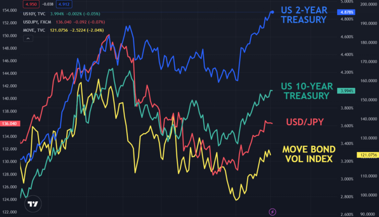 USD/JPY, MOVE INDEX, US 2- and 10-YEAR TREASURY YIELDS
