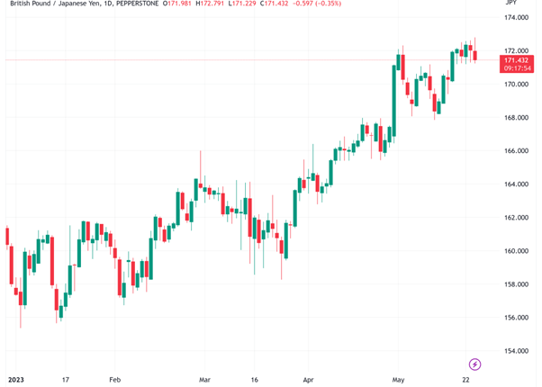 Headline UK inflation fell in April, albeit by less than economists had expected. At an annualized rate of 8.4%, it came in below the 9% level for the first time in a year. However, that deceleration will offer scant hope to consumers, with food prices still surging. Given this data, it’s all but certain that UK borrowing costs have further to rise, with GBP/JPY pricing that risk accordingly with a rise to seven-year highs this year.