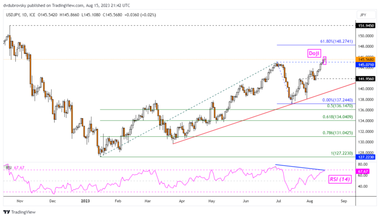 On the daily chart below, USD/JPY has left behind a Doji candlestick pattern. This is an early sign of indecision, especially within trending markets. Meanwhile, there is the presence of negative RSI divergence, a classic signal of fading upside momentum. This is as prices struggle to confirm a breakout above the June high of 145.07.