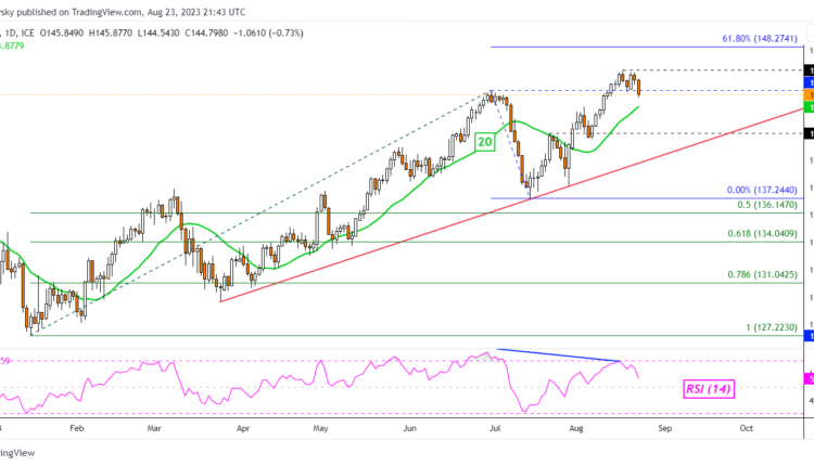 Breaking under the line may open the door to extending losses that the Double Top could be insinuating. That places the focus on the 38.2% Fibonacci retracement level of 142.99 before the current August low of 141.50 comes into focus. Otherwise, closing above 146.56 opens the door to extending gains towards the 61.8% Fibonacci extension level of 148.27 seen on the daily chart above.
