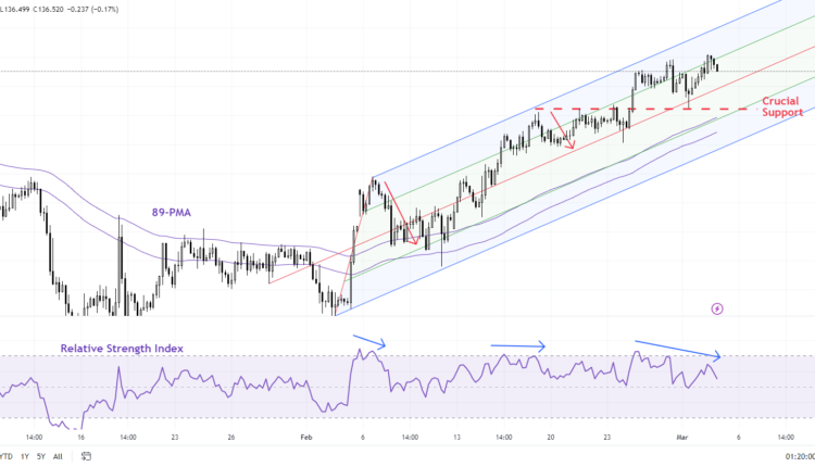 Negative divergence on the 240-minute and daily charts indicates that the rebound is beginning to look tired. To be sure, there is no sign of reversal of the nascent uptrend just yet. USD/JPY would need to break below immediate support on a horizontal trendline from about 135.25 for the short-term upward pressure to fade. Furthermore, any break below 133.75-134.50: including the 89-period moving average on the 240-minute chart, the lower edge of a rising pitchfork channel from January, and the February 24 low, would raise the odds that the short-term uptrend was reversing.