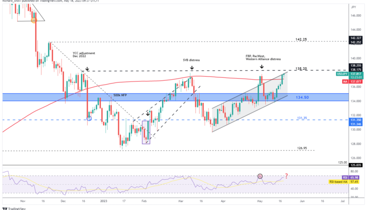 USD/JPY trades on the cusp of the upper side of the ascending channel which has, but for the prior false breakout, contained price action thus far. The pair now trades above the 200 SMA, flirting with the crucial 138.20 level of resistance – a level that has been approached multiple times this year without the needed momentum to trade above. However, given that this move involves both a weak yen and stronger dollar, momentum may be on the side of USD/JPY bulls. A lot will depend on whether an agreement can be reached on the debt ceiling this week.