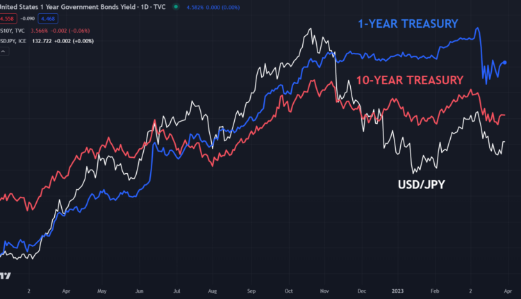 USD/JPY AGAINST 1- AND 10-YEAR TREASURY YIELDS