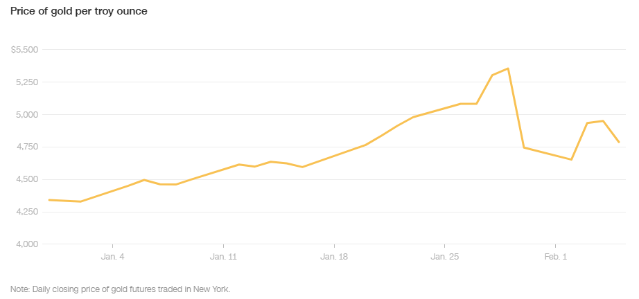 Bạc cũng trải qua những biến động không kém phần ngoạn mục. Giá bạc đã tăng hơn gấp ba lần trong năm qua trước khi lao dốc 31% vào ngày 30/1, ghi nhận ngày tệ hại nhất kể từ 1980. Dù vậy, bạc vẫn duy trì mức tăng khoảng 138% tính từ đầu năm trước.