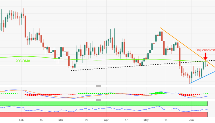 The Kiwi pair’s latest weakness justifies the Doji candlestick on the Daily chart formation. The bearish candlestick gains even more important as it marks the reversal in the NZD/USD price from the key 0.6150 resistance comprising the 200-DMA and previous support line stretched from early March.