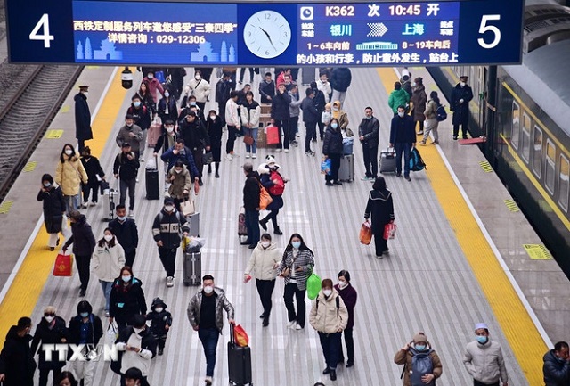 Hành khách tại nhà ga tàu hỏa ở tỉnh Thiểm Tây, Trung Quốc. (Ảnh: THX/TTXVN)