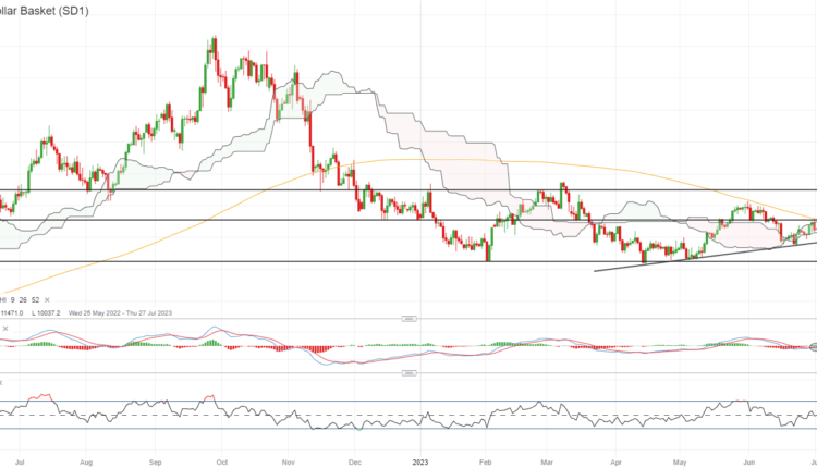 Rate expectations remain largely unswayed by the Fed minutes, with a continued lean towards an additional 25 basis-point rate hike after July to conclude the Fed’s hiking process. Nevertheless, US Treasury yields found their way higher, with the 10-year yields surging to a new three-month high. The US dollar received an uplift (+0.2%) overnight as well, seemingly headed back to retest the key 103.12 level of resistance once more. The formation of higher highs and higher lows since mid-June reflects buyers attempting to take back some control, while the RSI has defended its key 50 level thus far. Further upmove above the 103.12 level could place a retest of its May 2023 high in sight.