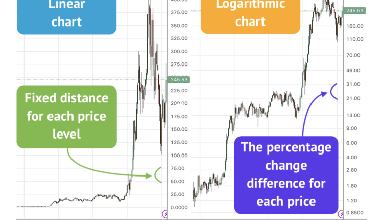 Logarithmic price charts are used in financial analysis to represent and analyze the price movement of an asset over time. Unlike linear price charts, which have a constant scale, logarithmic price charts use a logarithmic scale for the price axis. The logarithmic scale on the price axis is particularly useful when dealing with assets that experience large price variations over time, such as stocks, cryptocurrencies, or commodities. By using a logarithmic scale, the vertical distance between two points on the chart represents the percentage change in price rather than the absolute change.