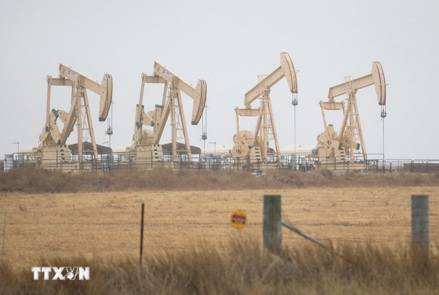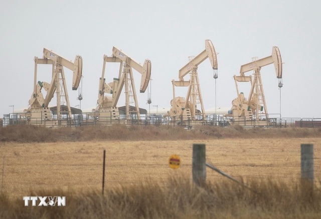 Tháp khoan dầu ở Three Rivers, Texas (Mỹ). (Ảnh: THX/TTXVN)