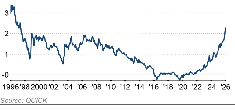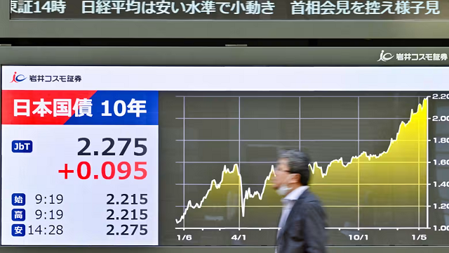 Lợi suất trái phiếu chính phủ Nhật Bản (JGB) kỳ hạn 10 năm dễ dàng vượt mốc tâm lý 2.2% trong buổi sáng, trước khi chạm mức cao nhất trong 27 năm là 2.275% vào buổi chiều, tăng 0.09 điểm phần trăm so với cuối tuần trước.
