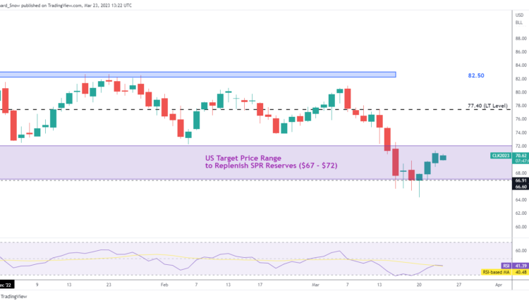 For most of Q1 2023 WTI crude oil prices oscillated between two very crucial levels as traders attempted to gauge the longer-term direction of the commodity. The level of resistance at $82.50 provided a solid ceiling, while the upper band of the $67 – $72 target zone to replenish SPR supplies provided support for most of the quarter, until we saw a late push, deeper into the target range, towards $67 where prices struggled to achieve a daily close below that level. While this article concentrates on oil‘s technical landscape, the oil market is heavily influenced by fundamentals like demand and supply – download the full Q2 forecast below: