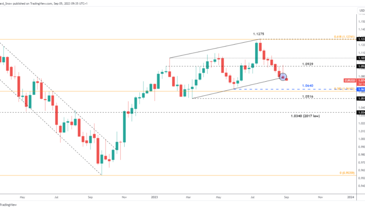 EUR/USD price action over the last two weeks has highlighted the longer-term ascending channel that has recently come under pressure during the shorter-term selloff. The long upper wick on last week’s candle reveals a solid rejection of higher prices, turning the focus to possible breakdown potential.
