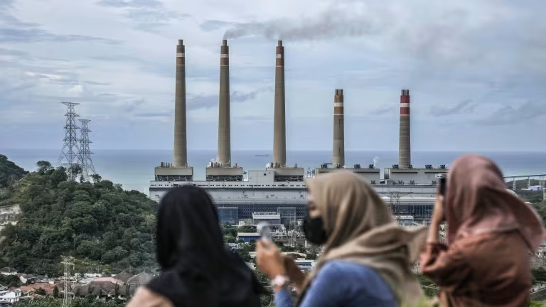 Những người phụ nữ nhìn về phía nhà máy nhiệt điện than Suralaya ở Cilegon, Indonesia. Nhiên liệu hóa thạch dự kiến sẽ tiếp tục đóng vai trò nổi bật trong sản xuất điện của Đông Nam Á trong nhiều thập kỷ tới. Ảnh: AP