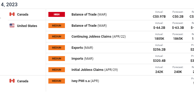 The Canadian dollar has been consolidating of recent after a major sell-off coinciding with declining crude oil prices. Concerns around a global economic slowdown have led to demand forecasts being revised while the ongoing banking crises has not allowed for commodity-linked currencies to prosper. Canada’s balance of trade report (see economic calendar below) beat estimates today (surplus) allowing for the loonie to find its footing against the USD while the US balance of trade figures slightly missed (deficit) in conjunction with a higher initial jobless claims print.