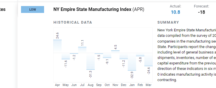 In a rather unexpected turn, the dollar has received a welcomed boost after significantly better than expected data from the NY Empire State Manufacturing Index. The index, after registering four successive prints below zero (indicating a contraction), rose to 10.8 when only forecasted to come in at -18.