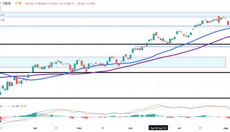 The S&P 500 broke below the 30-day Simple Moving Average (SMA) last Friday. This was unexpected as the index has been rising above its 9-day counterpart for a while now, and traders might have expected the index to find support at 4,500. The 50-day SMA closer to 4,400 now seems like a reasonable level to test. Further support lies at 4,325 and 4,300.