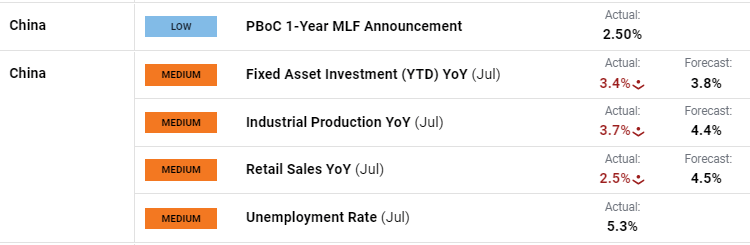 The People’s Bank of China (PBoC) unexpectedly cut its one-year medium-term lending facility – the rate at which Chinese banks borrow money from the PBoC – by 15 basis points from 2.65% to 2.50% earlier today in an effort to boost the world’s second-largest economy. This is the second rate cut in the last three months after the PBoC trimmed rates by 10 basis points in June. The nature, and size, of the cut spooked the market and fueled fears that Chinese growth is waning further. These fears were crystalized post-release as the latest set of Chinese data showed industrial production falling by more than forecast, while retail sales also turned lower. On August 21 the one-year and five-year Chinese loan rates are announced and traders need to be aware that these may also be trimmed.