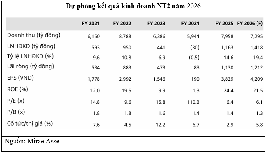 Mirae Asset dự báo doanh thu thuần và lợi nhuận sau thuế của NT2 năm 2026 đạt lần lượt 7,295 tỷ đồng, giảm 8% và 1,212 tỷ đồng, tăng 7% để phản ánh tính thận trọng trước giới hạn nguồn cung khí nội địa (GAS cam kết 0.6 tỷ m3).