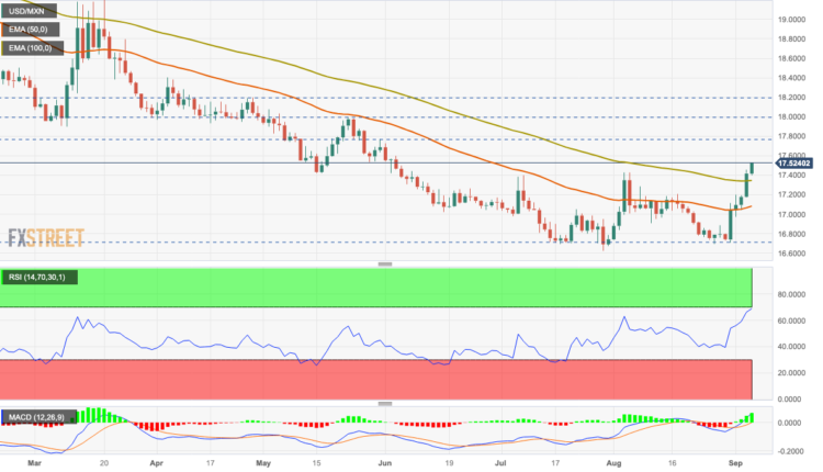 - USD/MXN gains momentum for the fourth straight day, holds above the 50- and 100-day EMAs on the daily chart.