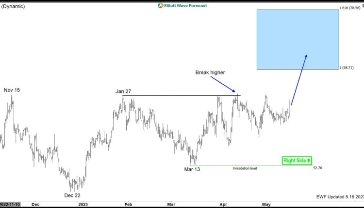 The stock has been choppy and trading sideways since the peak on Nov 15, 2022 and the low on Dec 22, 2022. Unable to make new highs or new lows below those 2 pivots kept it trapped in a sideways range until April 2022. The break higher triggered multiple bullish sequences against Mar 13th and Dec 22nd. One can also observe the price action making higher lows since Dec 2022. Every pullback was being bought and now with a break higher, it is expected to remain supported towards the extreme area at $68.71 – 78.56 before a pullback can happen. We like buying dips in 3, 7 or 11 swings at extreme areas until that target is reached.