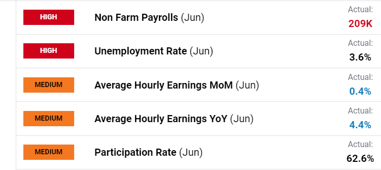 - The US Added 209,000 Jobs in June, Slightly Below the Forecasted Figure of 225,000. May Figure Revised Down to 306,000.