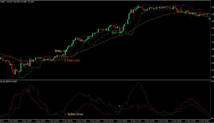 - Close the trade as soon as the green line of the Drive indicator crosses below the red line.