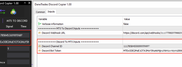 - Enter the Channel ID and Bot Token from step 4 into the EA as shown in screenshot. You can use the interface or paste it into the inputs.