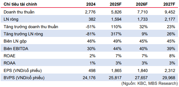 Tổng hợp lại, MBS điều chỉnh dự phóng lãi ròng năm 2025-2027 của KBC sẽ tăng 317%/9%/26% so với năm trước.