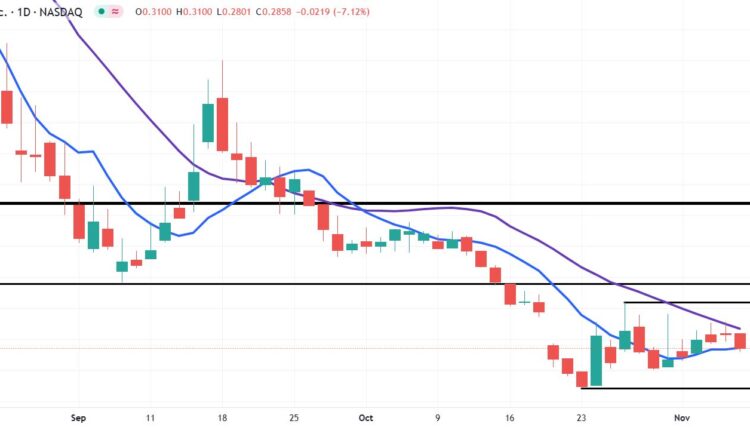 The support from late October near $0.22 is the only other supportive structure for traders at the moment, while bulls would want to target the October 26 range high just under $0.36. With longer topside wicks on the daily candlestick chart over the past two weeks, the upside appears limited.