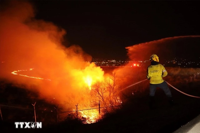 Lính cứu hỏa nỗ lực dập lửa cháy rừng tại Castaic, Los Angeles, California (Mỹ), ngày 22/1/2025. (Ảnh: THX/TTXVN)
