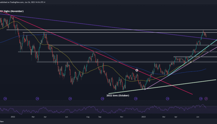 The Nasdaq 100 retreated on Monday, extending losses from the previous week, dragged down by heavy selling in the mega cap space. By way of context, Alphabet, Tesla and Nvidia suffered a deep setback as bullish sentiment continued to wane, hurting companies that have benefited from the “artificial intelligence” frenzy over the past few months.
