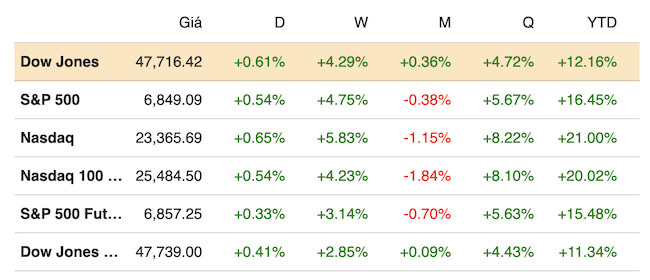Kết thúc phiên giao dịch ngày 28/11, chỉ số Nasdaq Composite tiến 0.65% lên 23,365.69 điểm, còn chỉ số S&P 500 cộng 0.54% lên 6,849.09 điểm. Chỉ số Dow Jones tăng 289.30 điểm (tương đương 0.61%) lên 47,716.42 điểm. Phố Wall đã trở lại sau kỳ nghỉ lễ Tạ ơn với phiên giao dịch ngắn vào ngày thứ Sáu.