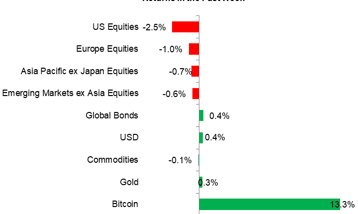 The MSCI All Country World index dropped 2.0%, the S&P 500 index fell 2.6%, and the Nasdaq 100 index declined 2.6%. The German DAX 40 fell 0.7% and the UK FTSE 100 dropped 1.4%. In Asia, the Hang Seng index fell 1.3%, while Japan’s Topix was mostly flat. Risk-sensitive currencies, including the Australian dollar and the New Zealand dollar, were mostly lower. Bitcoin continued its spectacular run, up 13% during the week.