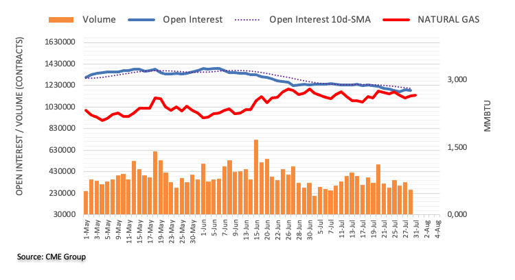 Friday’s decent bounce in prices of natural gas was on the back of diminishing open interest and volume, removing some strength of a sustained rebound in the very near term at least. So far, the commodity remains poised to extend the ongoing consolidative phase, with gains limited around the June high near $2.90 per MMBtu.