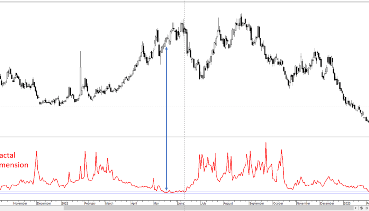 Market diversity as measured by fractal dimensions appears to be low as natural gas is at multi-month lows. Fractal dimensions measure the distribution of diversity. When the measure hits the lower bound, typically 1.25-1.30 depending on the market, it indicates extremely low diversity as market participants bet in the same direction, raising the odds of a price reversal. For natural gas, the 65-day fractal dimension is currently around 1.28, around the same level that led to a downward correction in mid-2022 (see chart).