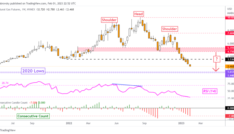 On the weekly chart below, natural gas continues to make downside progress in the aftermath of a bearish Head & Shoulders chart formation. The ultimate target of the formation is the 2020 low, which makes for a key range of support around 1.44 – 1.61. The commodity is now heading for a 7th week of consecutive losses, the most since October. It is down about 13.4% this week so far, the most since early January.