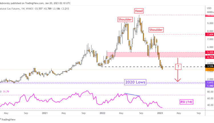 Prices have been trading in the anticipated downward trajectory of a bearish Head and Shoulders chart pattern, bringing natural gas closer towards the 1.44 – 1.61 support zone. The commodity broke under this pattern in late 2022, confirming a breakout earlier this month. That has opened the door to resuming what has been the dominant downtrend since the summer of 2022.