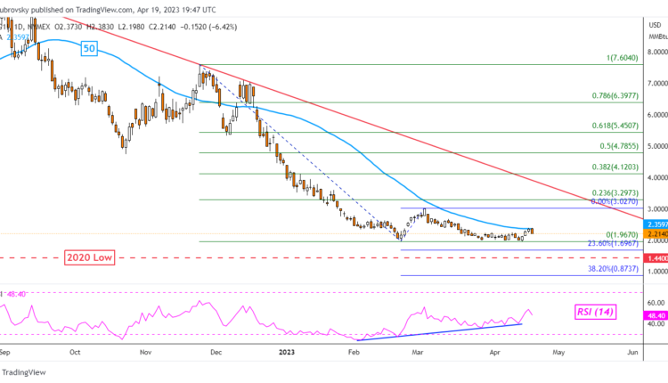 Natural gas prices fell over 6% on Wednesday, ending a 3-day winning streak which was the longest since the end of February. Leading into the 3-day rise, positive RSI divergence was showing that downside momentum was fading. That can at times precede a turn higher. But, it seems broader downside forces remain in focus for the heating commodity.