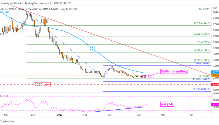 Natural gas price volatility has notably cooled in recent days with the heating commodity appearing to stabilize after persistent losses earlier this year. Prices have been unable to clear the current 2023 low (which is also the February low) at 1.967. At the same time, positive RSI divergence has been showing that downside momentum has been fading.