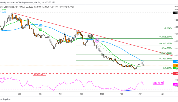 Focusing on the daily chart below, natural gas is back to the 20-day Simple Moving Average (SMA). The latter is immediate support. A confirmatory breakout lower could open the door to revisiting the February low at 1.967. Beyond the latter is the 2020 bottom at 1.44. Meanwhile, immediate resistance is a combination of the 50-day SMA and the 23.6% Fibonacci retracement level at 3.297.
