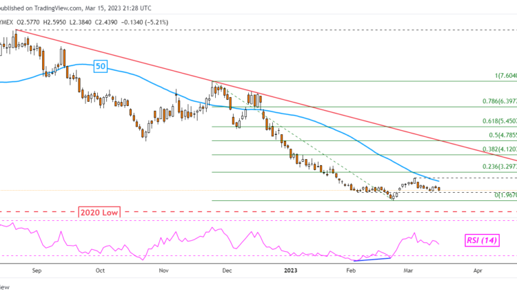 This is holding as immediate support. Breaking lower exposes the February low at 2.341. Beyond the latter sits the bottom from 2020 at 1.44. A meaningful push higher would likely entail clearing past the 50-day Simple Moving Average (SMA) as well as the March 3rd high at 3.027. The broader technical outlook remains bearish, with the falling trendline from August maintaining the dominant downside focus.