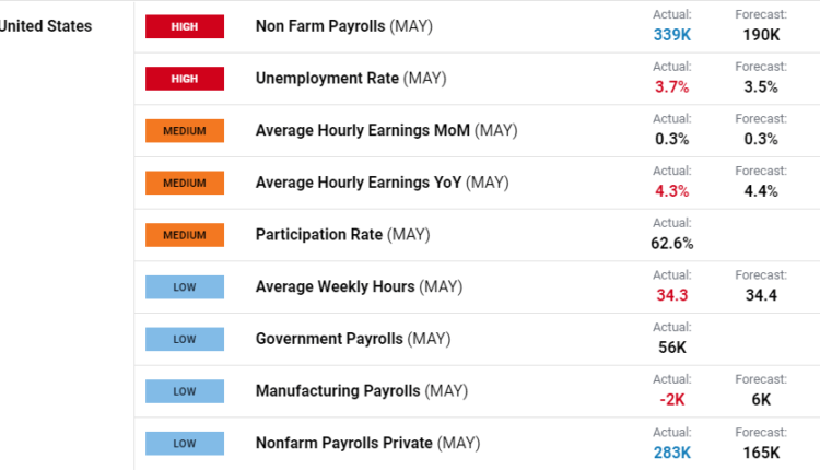 • The US Added 339,000 Jobs in May, Surpassing the Average Forecast of 190,000 New Payrolls. Aprils Figure Meanwhile Was Revised Higher to 294,000.