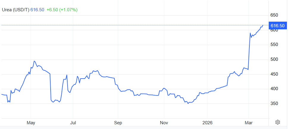 Giá urê đã tăng hơn 230 USD/tấn, tương đương khoảng 50%, từ 482.50 USD/tấn (FOB Ai Cập) ngày 27/02 lên 720 USD/tấn ngày 17/03. Giá amoniac cũng tăng 115 USD/tấn (24%), từ 495 USD/tấn (FOB Trung Đông) lên 600 USD/tấn ngày 18/03. Các cuộc tấn công vào hạ tầng năng lượng và tình trạng bất khả kháng có thể tiếp tục siết chặt nguồn cung.