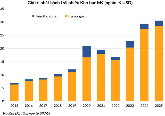 Giảm gánh nặng nợ công là mục tiêu rõ ràng, dễ thấy nhất. Trong năm tài khóa 2025, chi phí lãi vay của Chính phủ liên bang là 970 tỷ USD, tương đương 3.2% GDP. Tổng nợ công của Mỹ hiện đã vượt 38.5 ngàn tỷ USD, mỗi năm Chính phủ Mỹ đều phải phát hành hàng chục ngàn tỷ USD trái phiếu để trả nợ cũ và tài trợ cho thâm hụt tài khóa.