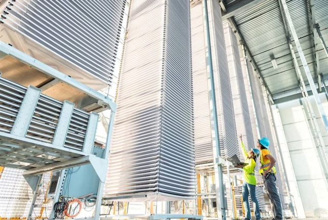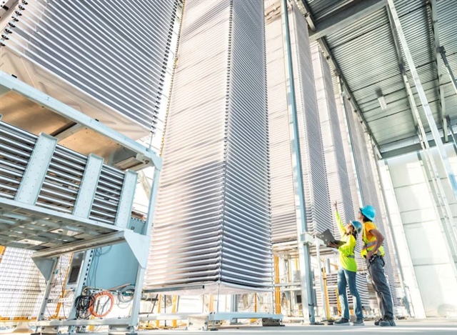 Chồng khay đựng đá vôi đã qua xử lý, được sử dụng để hấp thụ CO2 từ không khí tại nhà máy của công ty Heirloom ở Tracy, California, Mỹ. Ảnh: Reuters