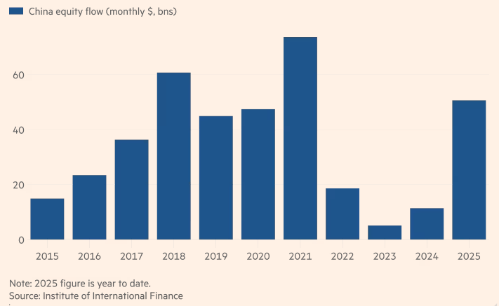 Trong 10 tháng đầu năm, dòng vốn nước ngoài vào cổ phiếu Trung Quốc đạt 50.6 tỷ USD, tăng từ 11.4 tỷ USD năm 2024, theo dữ liệu từ Viện Tài chính Quốc tế (IIF), tổ chức ngành đại diện cho ngành ngân hàng toàn cầu.