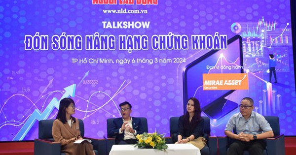 Các diễn giả trao đổi tại buổi talk show chứng khoán với chủ đề “Đón sóng nâng hạng chứng khoán”, do Báo Người Lao Động tổ chức ngày 6-3.Ảnh: TẤN THẠNH