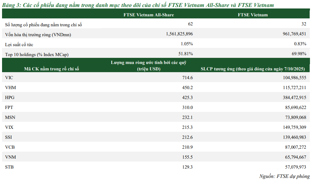 Báo cáo đánh giá nâng hạng thị trường được Chứng khoán Phú Hưng (PHS) cập nhật ngay trong ngày 08/10 có trích dẫn thông tin từ báo cáo mới nhất của FTSE Russell, nêu rõ hiện có khoảng 62 mã cổ phiếu nằm trong rổ chỉ số FTSE Vietnam All-Share, trong đó 32 mã nằm trong FTSE Vietnam. Sau khi nâng hạng, các cổ phiếu này sẽ hưởng lợi đầu tiên.