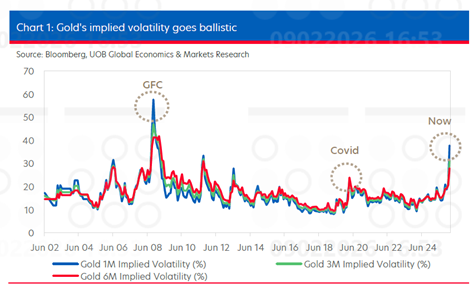 Đã có nhiều phân tích và đánh giá lại sau đợt tăng mạnh và cú lao dốc sâu của giá vàng vào cuối tháng 1. Khởi đầu năm ở mức trên 4,300 USD/oz, giá vàng đã tăng mạnh lên gần 5,600 USD/oz vào ngày 28/01, trước khi ghi nhận đợt bán tháo dữ dội giảm gần 10% vào ngày 30/01 về 4,900 USD/oz, sau đó tiếp tục lao dốc, có thời điểm xuống dưới 4,500 USD/oz vào ngày 02/02. Trong bối cảnh biến động 2 chiều cực mạnh này, mức biến động kỳ vọng (implied volatility) của vàng đã tăng lên trên 30% – cao hơn đáng kể so với giai đoạn khủng hoảng COVID, dù vẫn thấp hơn các mức cực đoan từng ghi nhận trong thời kỳ Khủng hoảng Tài chính Toàn cầu (GFC).