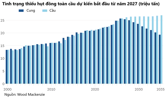 S&P Global dự báo thị trường sẽ đối mặt với mức thâm hụt 10 triệu tấn đồng vào năm 2040. BMO Capital Markets thì dự báo thiếu hụt 9 triệu tấn vào năm 2030.